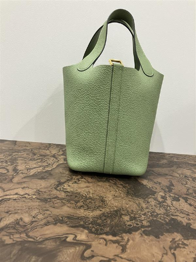 東京都新宿区にお住まいのお客様から、エルメス ピコタンロック18 PM トリヨンクレマンス ヴェールクリケットをお持ち込みいただきました。ゴールド金具×淡いグリーンの上品な組み合わせが特徴で、使用感の少ないABランクの美品。相場を超える36万円の買取を実現しました。エルメスの中でも人気の高いピコタンロックは、新宿エリアでも特に注目度が高く、経験豊富な査定士が素材・刻印・状態を正確に評価しました。