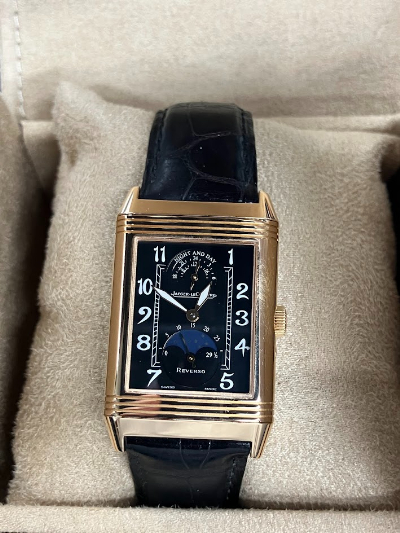 東京都足立区のお客様より、ウィンクル銀座店にてジャガールクルト レベルソ サンムーン 270.2.44 PG×革 手巻き 黒文字盤を買取いたしました。50本限定モデルの希少性と状態の良さ、そしてジャガールクルトのブランド価値が相まって、相場を上回る120万円での高価買取を実現。経験豊富な査定士が丁寧に対応し、ご満足いただける取引となりました。