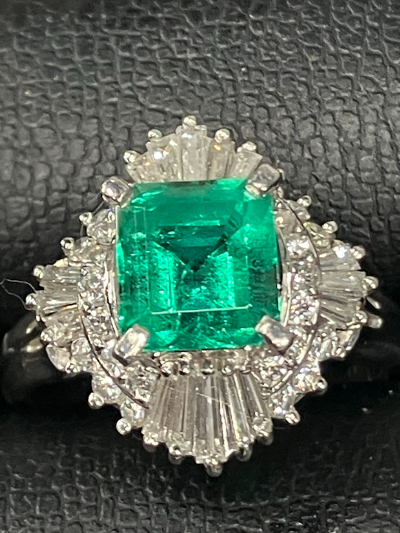 エメラルドダイヤリングの買取市場は、ここ数年安定した動きを見せています。特に鮮やかなグリーンカラーのエメラルドは世代を問わず人気があり、資産価値を意識して購入される方も少なくありません。エメラルドはベリルという鉱物の一種で、クロムやバナジウムを含むことであの美しい緑色を発色します。多くのエメラルドには天然由来の内包物が見られ、それが「天然の証」として評価されることもあります。ダイヤモンドが周囲を取り巻くデザインは王道で、華やかさと格式を兼ね備えた印象を与えます。今回のリングはPt900素材が使用されており、プラチナ特有の重厚感がエメラルドの色味をより引き立てていました。プラチナ台は変色しにくく、長年愛用できる点でも評価が高い素材です。フォーマルな場面はもちろん、記念日ジュエリーとしても需要があるため、中古市場でも一定の人気を保っています。だからこそ、状態が良く鑑別書が揃ったお品は相場以上の査定につながりやすいのです。