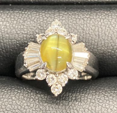 東京都渋谷区のお客様より、クリソベリルキャッツアイ ダイヤリングをウィンクル銀座店でご売却いただきました。Pt900素材、33.3gのボリュームに14.68ctの大粒キャッツアイと2.20ctのダイヤが配されたリングで、相場20~35万円を大きく上回る60万円での高価買取が実現しました。シャトヤンシーの美しさや希少性が高評価につながり、専門鑑定士が一つひとつの魅力を丁寧に見極めました。