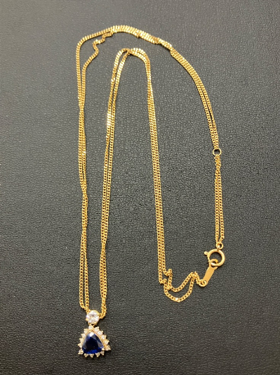 兵庫県加古川市にお住まいのお客様から、K18素材のサファイアダイヤネックレス(1.118ct/0.348ct)をウィンクル梅田店にて買取いたしました。トリリアントカットの希少なサファイアとデザイン性の高いダブルチェーンが特徴で、鑑別書付きのため高品質が保証されたジュエリーでした。一般相場を上回る10万円での高価買取を実現し、専門鑑定士による丁寧な査定にお客様もご満足のご様子でした。