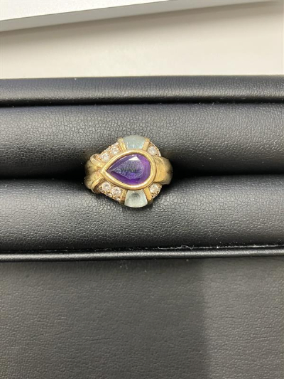 兵庫県西宮市在住のお客様から、色石ダイヤリング750をウィンクル梅田店にてお売りいただきました。ブランド刻印のないリングでしたが、アメジストの色味や透明感、デザイン性、さらにメレダイヤの存在が高く評価され、一般的な相場を上回る14万円での買取が成立しました。宝石買取に強い店舗ならではの査定事例です。