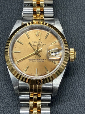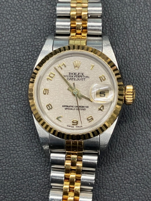 東京都港区のお客様から、ロレックス デイトジャスト 79173 SS×YG AT アイボリーホリコン文字盤をウィンクル銀座店にお持ち込みいただきました。ロレックスを代表する人気モデルのデイトジャストに、珍しいホリコン文字盤仕様が加わり、相場45〜50万円を超える58万円での査定となりました。銀座での豊富な実績と専門知識により、安心して時計買取をお任せいただけます。