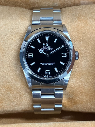東京都江戸川区在住のお客様より、ロレックス エクスプローラーⅠ 14270 SS AT 黒文字盤をウィンクル銀座店にてお買取いたしました。人気モデルであることに加え、箱や保証書など付属品がすべて揃っていたことが評価され、一般相場を上回る80万円での高価買取を実現しました。専門知識を活かした丁寧な査定事例をご紹介します。